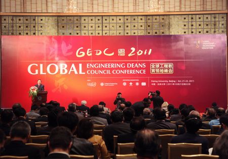 10月21日,2011全球工程教育领袖峰会——全球工学院院长大会在北京大学英杰交流中心隆重开幕,来自全球30多个国家和地区的200余位工学院院长齐聚北大,共商全球工程教育发展。北京大学党委书记朱善璐、校长周其凤,美国科学基金会指导委员会(National Science Board)主席Ray Bowen、全球工学院院长委员会(GEDC)主席David Garza Salazar、美国工程教育协会(ASEE)主席Don Giddens、中国工程教育协会副主席余寿文等出席了开幕式。开幕式由北京大学研究生院院长、工学院院长陈十一主持。