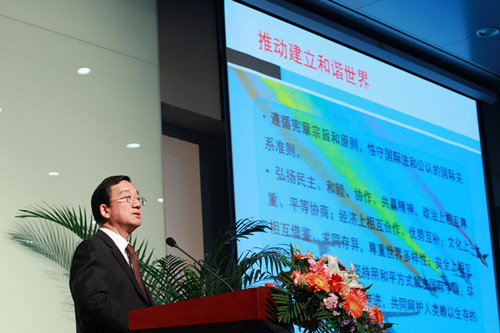 黄惠康说,在机遇前所未有,挑战也前所未有的新国际形势下,我国将依然坚定不渝地实行独立自主的和平外交政策,坚定不移的奉行互利共赢的开放战略,高举和平发展的大旗,全方位拓展和完善外交布局,同世界人民一道促进世界的和平发展。在解析完我国的外交理念和战略之后,黄惠康还向同学们仔细阐述了我国近年来外交上的巨大成就及当前仍面临的有关“主权,安全和领土”重大挑战。